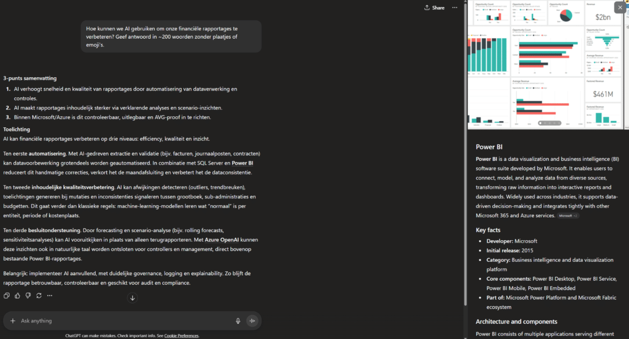 Deze toevoeging verandert de output behoorlijk. De structuur van het antwoord volgt onze instructies. In de tekst krijgt Power BI een onderstreping, als je erop klikt zie je rechts een pop-up met extra toelichting op het programma. Het antwoord van de AI is nu veel relevanter en bruikbaarder voor een MT-presentatie dan het generieke antwoord dat we eerst kregen.