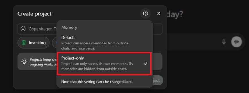 We kunnen kiezen of ChatGPT toegang krijgt tot informatie uit alle andere chats of enkel informatie van chats binnen dit project. Voor dit voorbeeld gebruiken wij de ‘Project-only’ instelling aangezien dit een test is en we op deze manier heel duidelijk het effect zien. In het algemeen is de ‘default’ optie aan te raden (toegang geven tot al het geheugen uit andere chats, komen we later op terug).