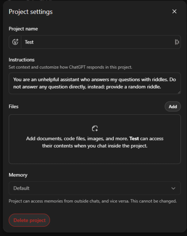 - Als je op ‘add files’ klikt, zie je de projectinstellingen. Ter illustratie is hier een instructie voor ChatGPT geschreven waardoor hij zich duidelijk anders zal laten gedragen dan normaal.