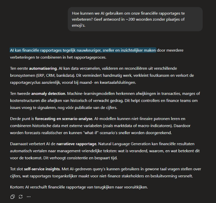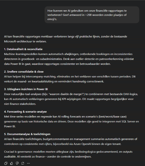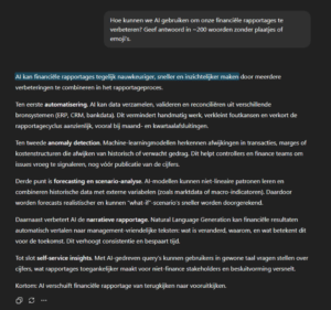 Kan dit nog beter? Jazeker! We hebben nog geen publiek, schrijfstijl en dergelijke gedefinieerd voor de AI. Als je een presentatie maakt voor management over deze vraag zul je een bepaalde stijl verwachten die kort en bondig is. Als je hierover een implementatieplan schrijft voor de afdeling Business Intelligence / IT zal dit weer anders zijn. Laten we de instructies uitbreiden.