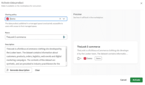 Een dataproduct publiceren op de Marketplace vereist dat je het activeert vanuit de Data Product-beheerinterface. Tijdens de activering selecteer je de managed space waar de gepubliceerde kopie verschijnt en gebruikers met de ‘Can Consume’-rol in die space kunnen het product dan zien. Belangrijk om te begrijpen: activeren publiceert een kopie naar de geselecteerde managed space, maar de onderliggende datasets blijven op hun oorspronkelijke locatie. De Marketplace is een discovery- en toegangslaag, geen dataverschuivingsmechanisme.