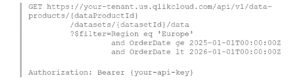 Omdat de endpoints het OData-protocol gebruiken, kunnen afnemers filterexpressies rechtstreeks in de query-URL toevoegen wanneer ze de API aanroepen. Zo kun je bijvoorbeeld een Sales Transactions-dataset filteren op datumbereik of regio zonder de volledige dataset op te halen. Hieronder zie je hoe zo’n aanroep er uitziet, gefilterd op records waarbij de regio Europa is en de orderdatum binnen 2025 valt: