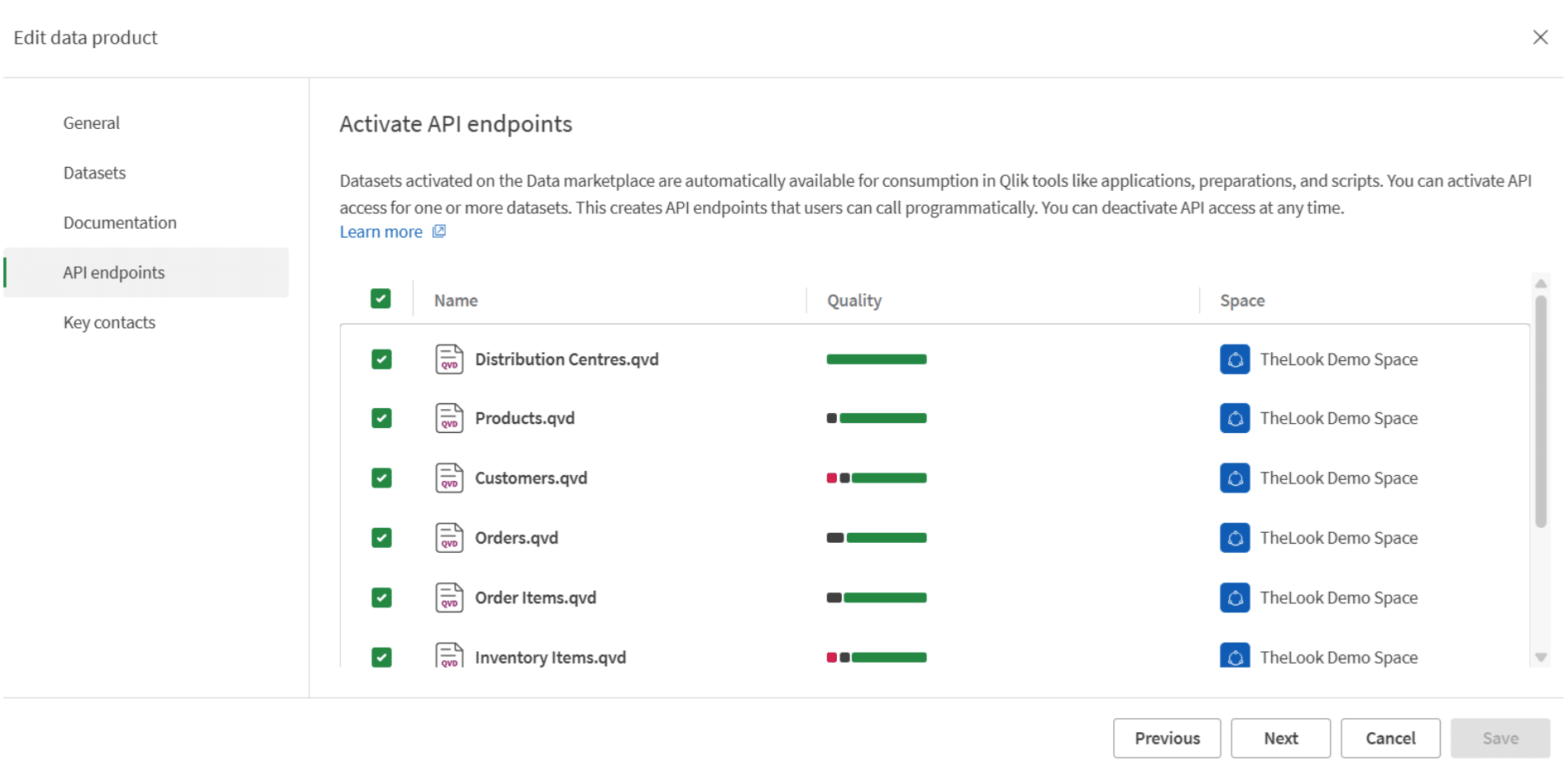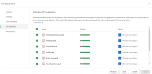 Het activeren van een API-endpoint is eenvoudig: navigeer binnen het dataproduct naar Edit > API endpoints, selecteer de datasets die je wilt blootstellen en sla op. Dat is de volledige configuratie in de interface. Qlik genereert vervolgens een OData-endpoint voor elke geselecteerde dataset en produceert automatisch een OpenAPI-compatibele specificatie op basis van de dataset-metadata, zodat ontwikkelaars direct kunnen zien wat het endpoint teruggeeft en hoe ze het moeten aanroepen, zonder dat ze iemand hoeven te vragen. Als je hebt geïnvesteerd in goede kolombeschrijvingen en semantische typen in deel 3, betaalt die investering zich hier ook uit.